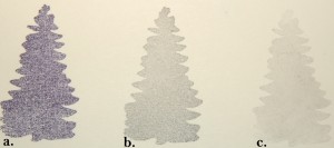 Image b. stamped in pigment ink: no blotchiness but image is barely there, as if it’s my 3rd impression stamp without re-inking.